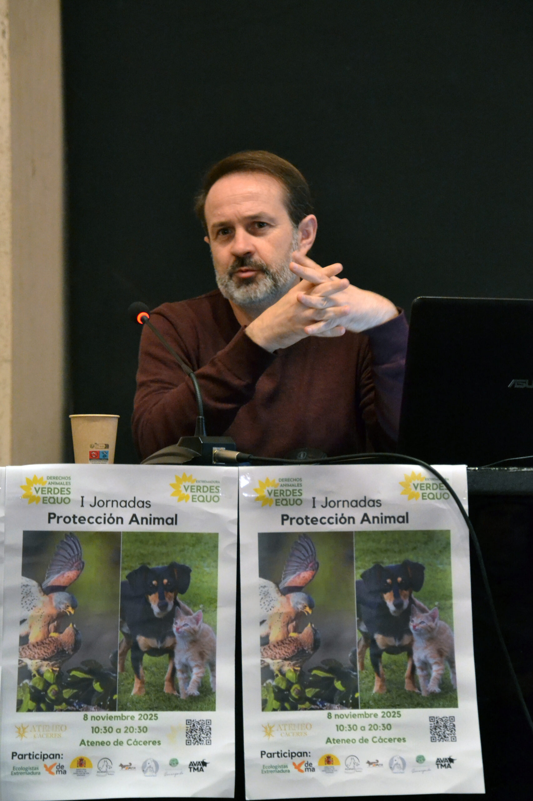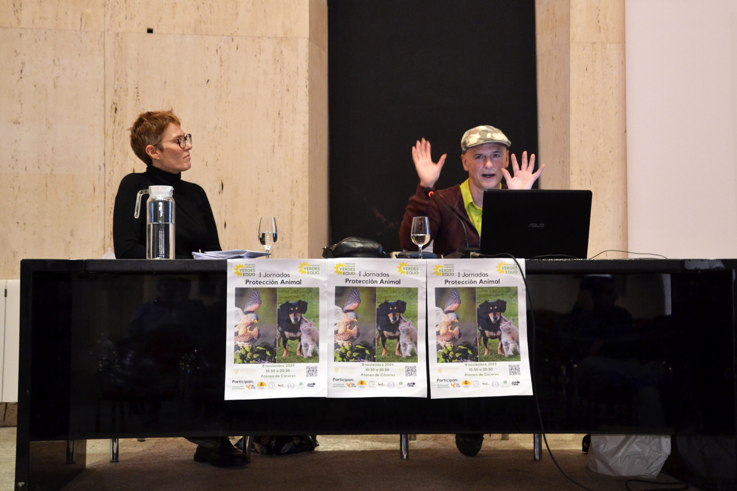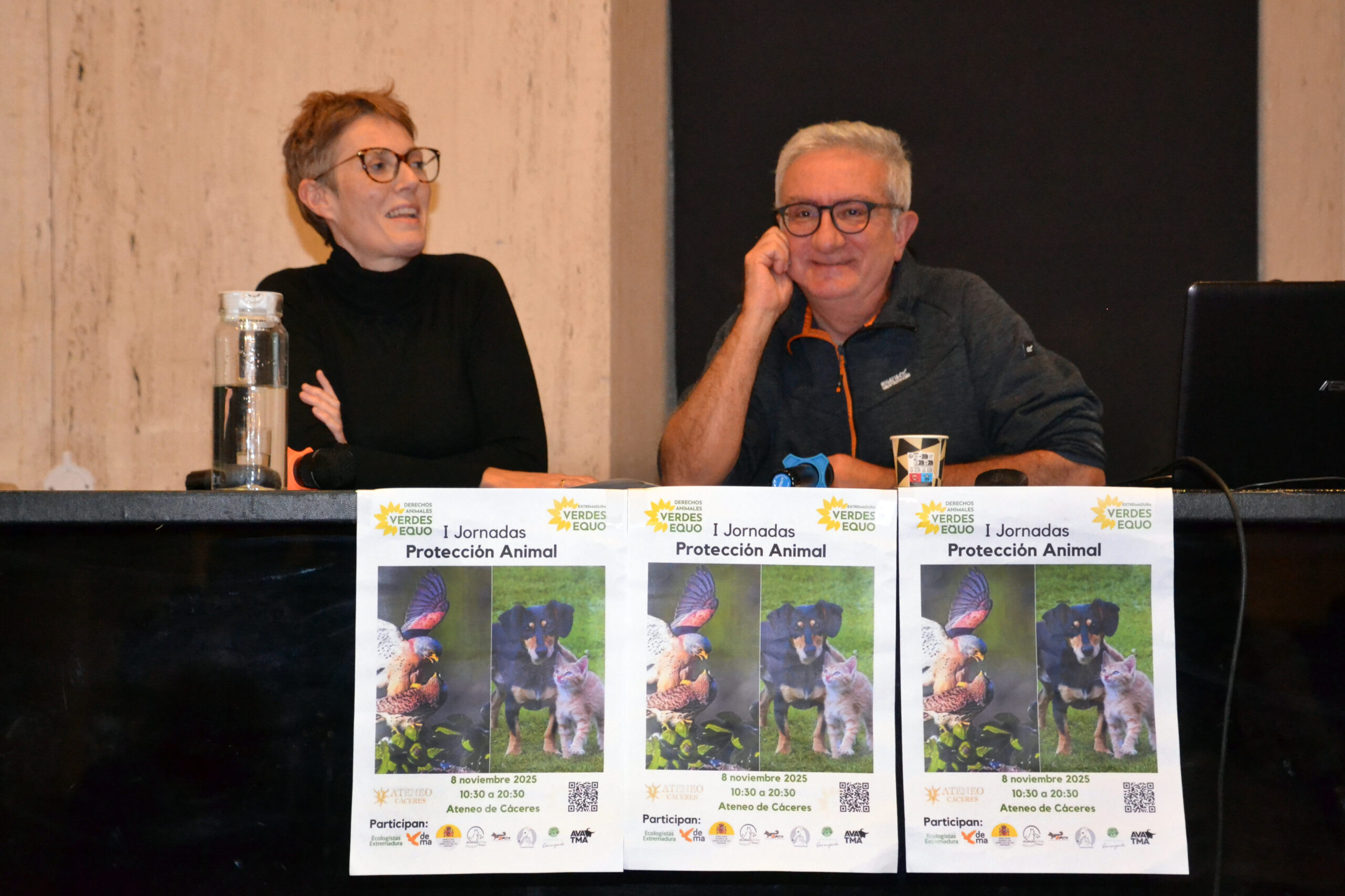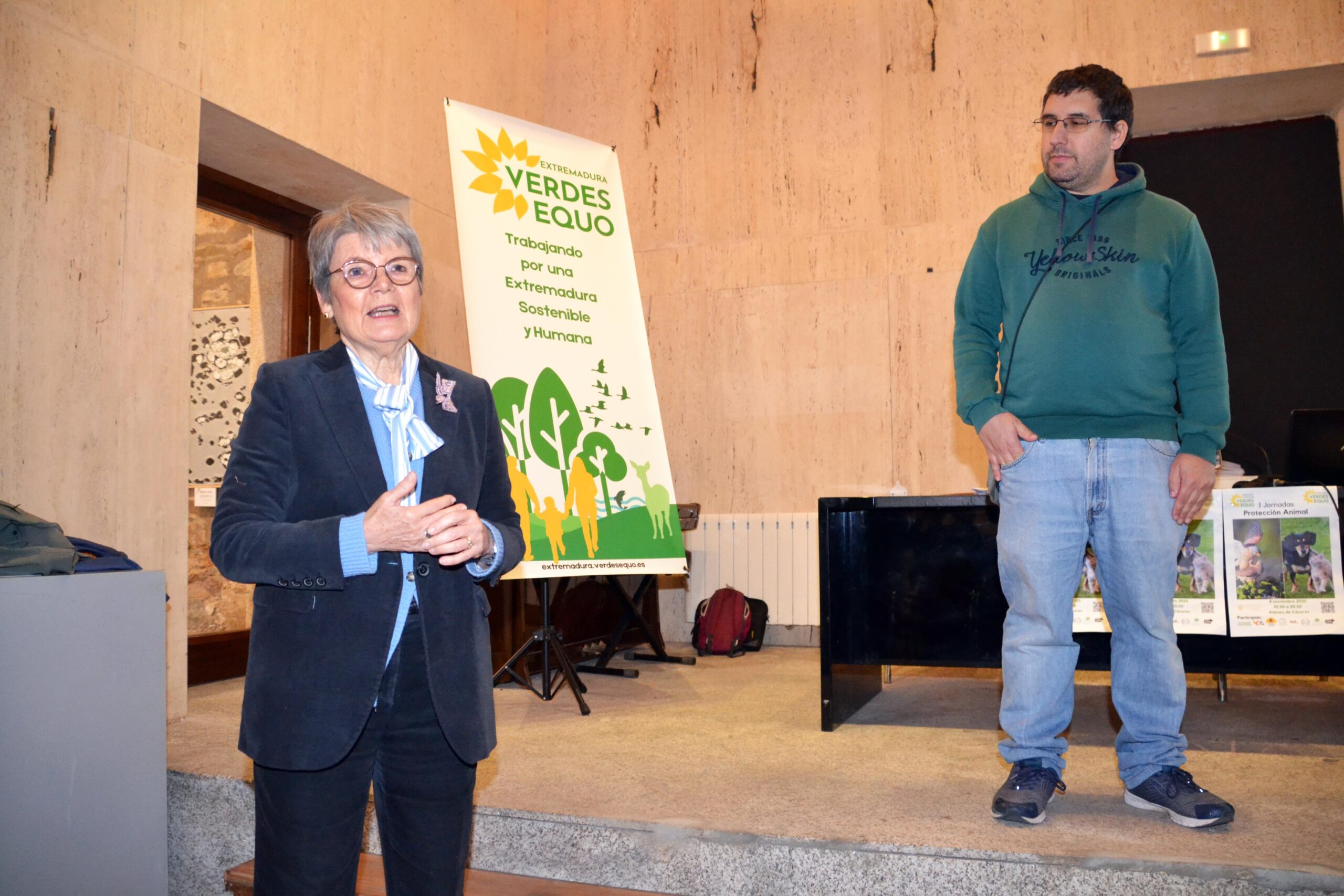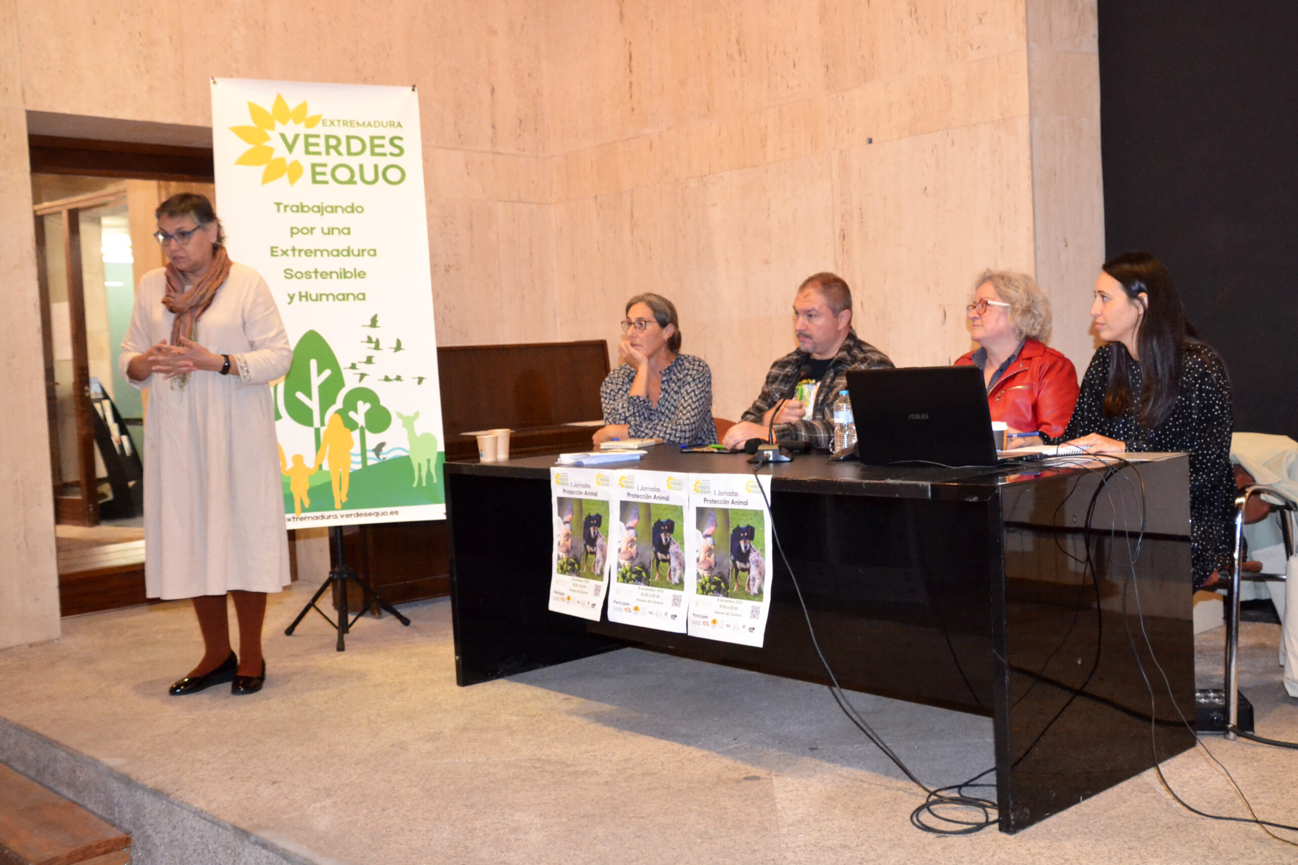 Las jornadas comenzaron con un saludo de Mª Ángeles López Lax, presidenta del Ateneo de Cáceres, lugar de la realización del evento, destacando la importancia de estas jornadas y de la capacidad de resistencia del colectivo que trabaja en mejorar el bienestar animal y el medio ambiente. Seguidamente intervino el coportavoz de Verdes Equo Extremadura, Juanan Cardoso, dando la bienvenida a las personas asistentes. A las Jornadas asistió Angélica García, Diputada de Agricultura de Cáceres.