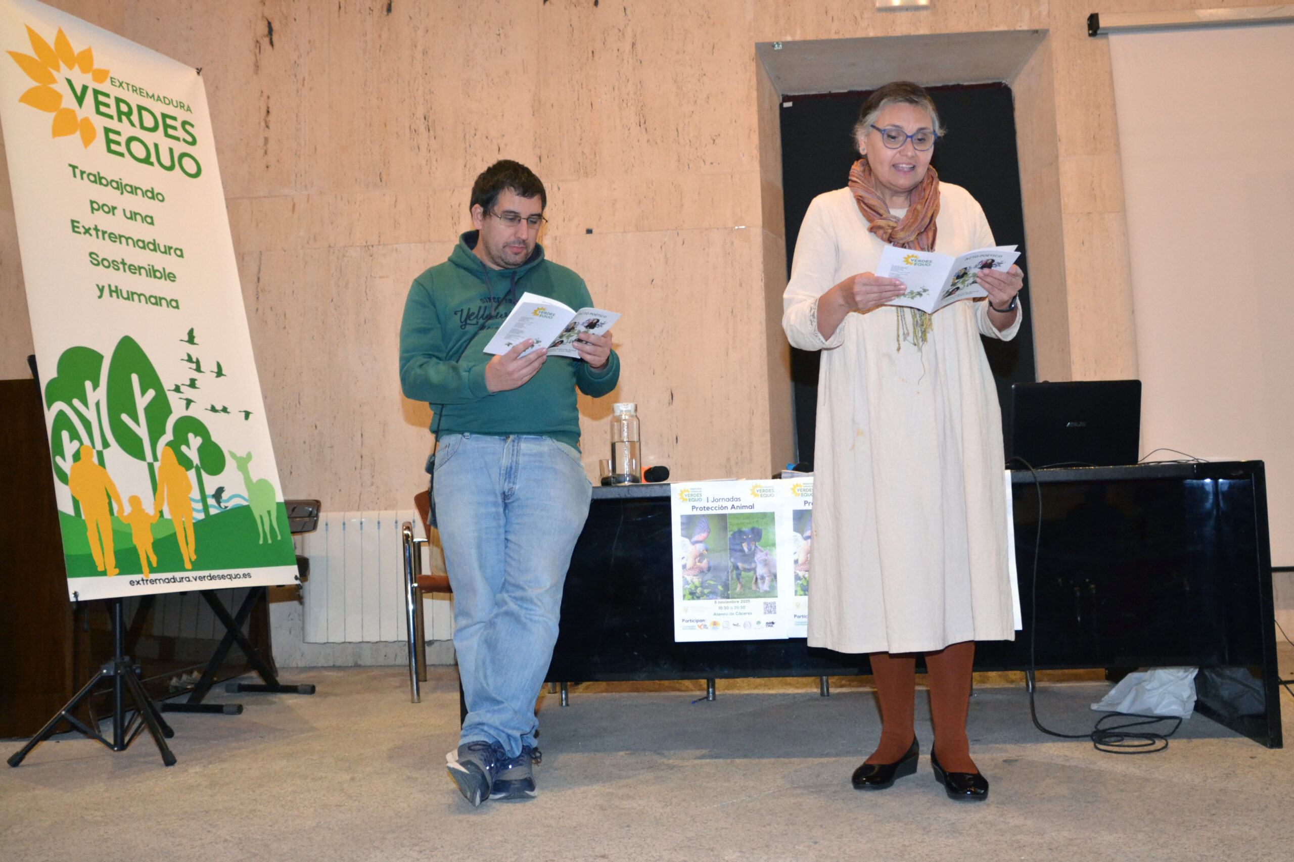 Para finalizar, Carmen Ibarlucea y Juanan Cardoso, coportavoces de Verdes Equo Extremadura, deleitaron al público con un recital poético, y entregaron a las personas asistentes un folleto con una selección de poemas escogidos para la temática tratada en las jornadas.